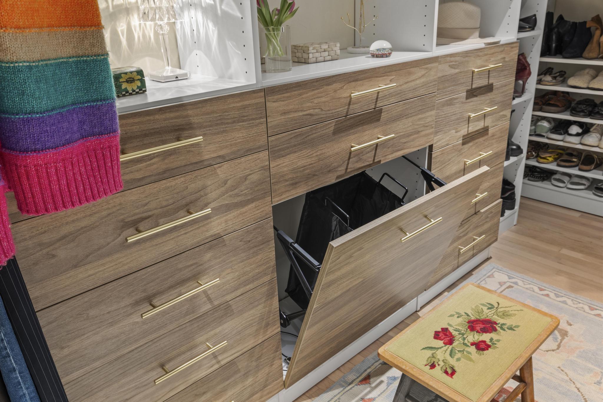 Laundry is unavoidable—but clutter must be avoided. Built-in hampers are one of the most practical features you can include in a custom closet system. By hiding worn or soiled clothes inside pull-out or tilt-out compartments, your closet stays cleaner both visually and functionally.
