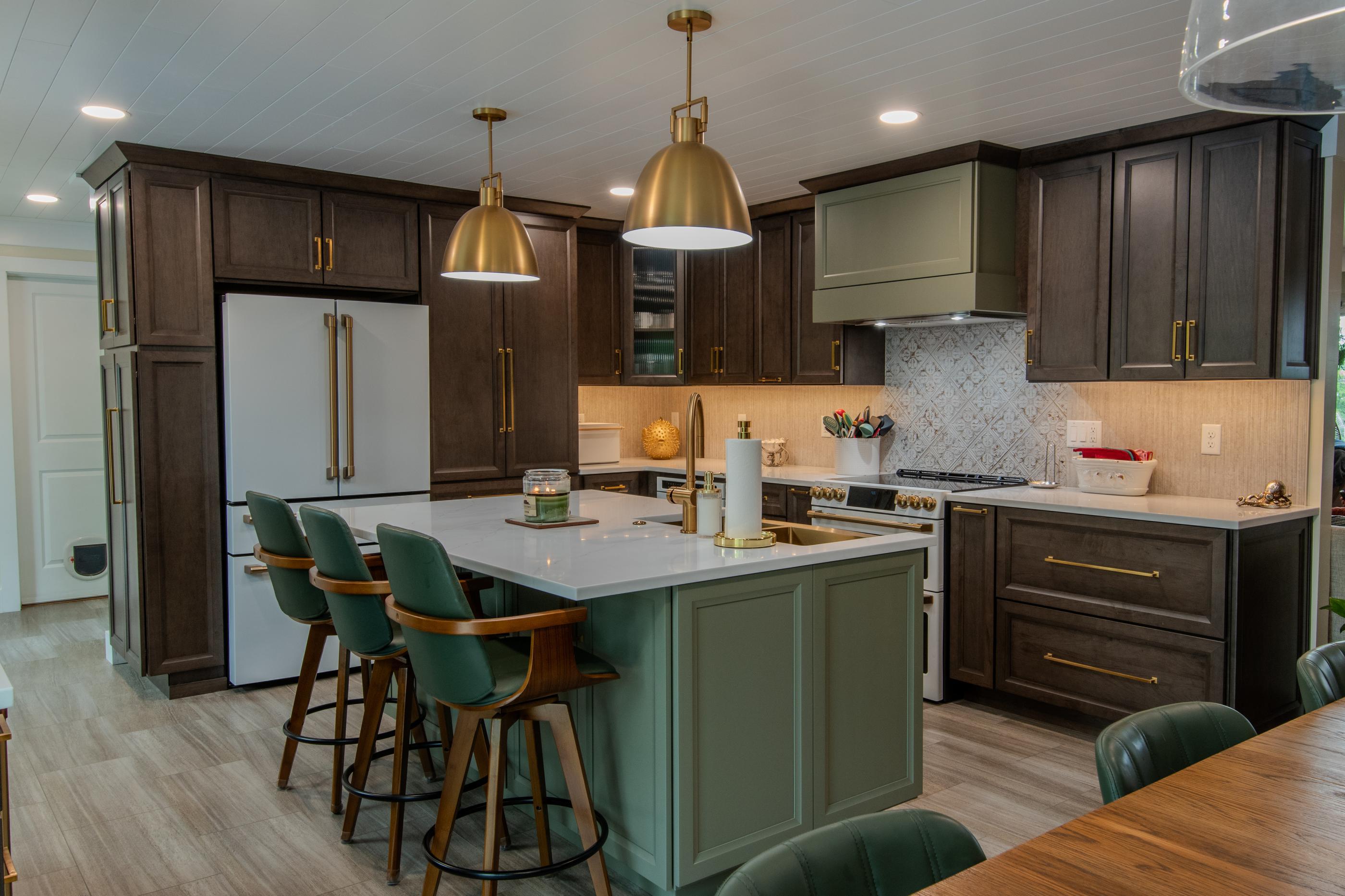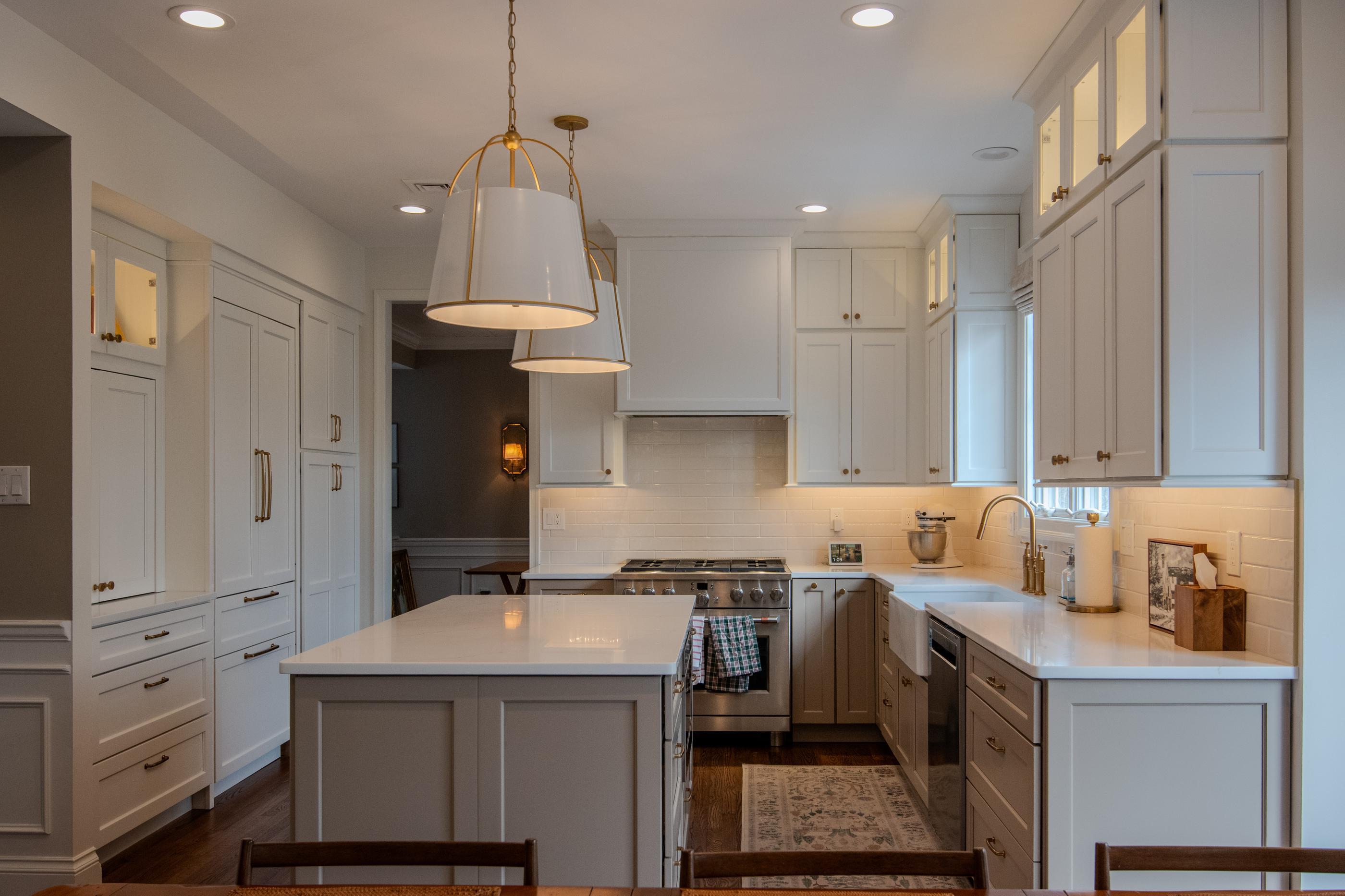 The Designery beautifully designed this recent two-tone kitchen remodel. It features the soft and stylish “Pebble” cabinet color. This proves that even lighter neutral colors can create a cozy kitchen.