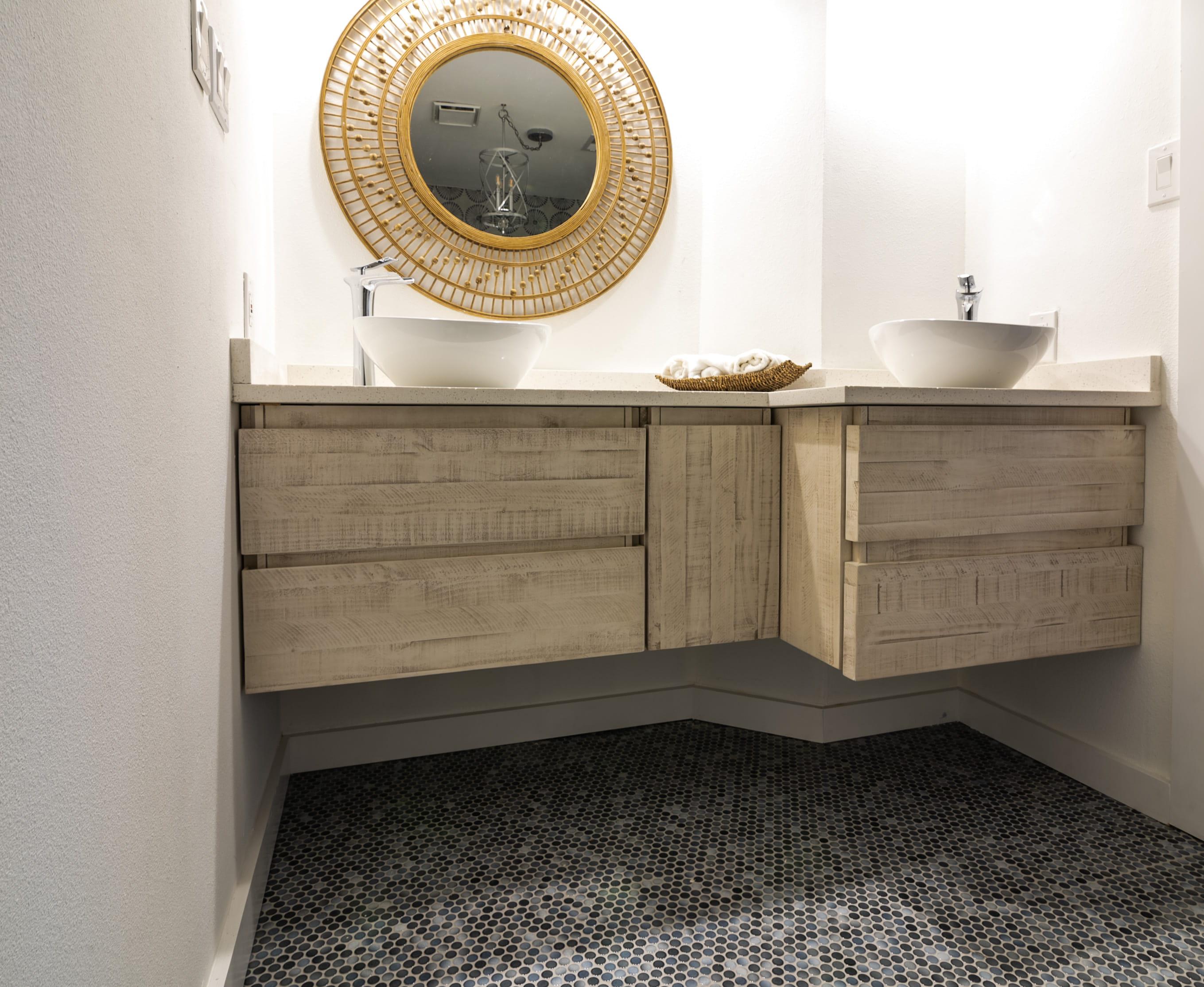 Penny tile continues to be a favorite in new bathroom floor trends thanks to its charm, flexibility, and timeless appeal. It looks nice on its own. You can also use it to create custom patterns and borders. With careful color placement, you can make subtle graphic designs.