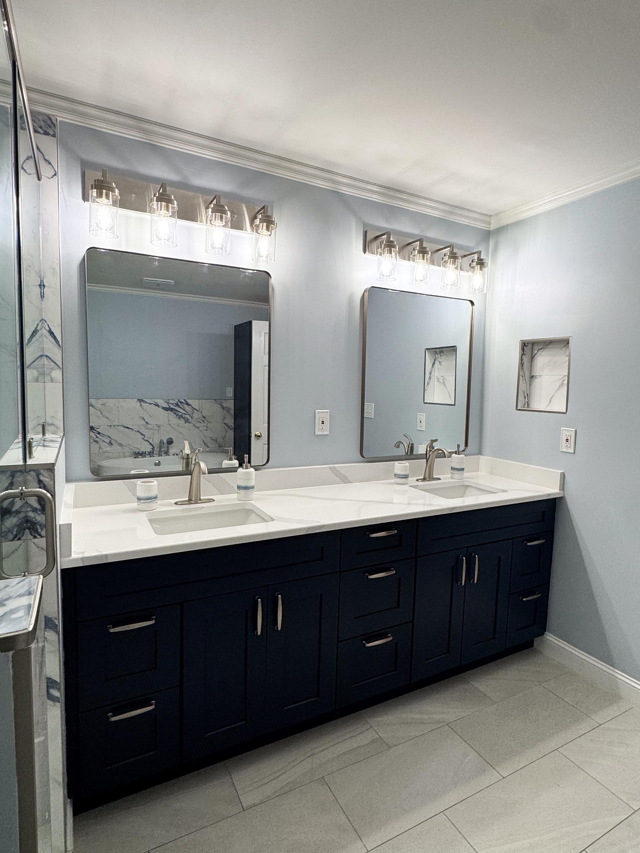 The centerpiece of this design is stone tile. The powdery painted walls draw on their softer blue shades within the veining, while the double vanity draws on the darkest.