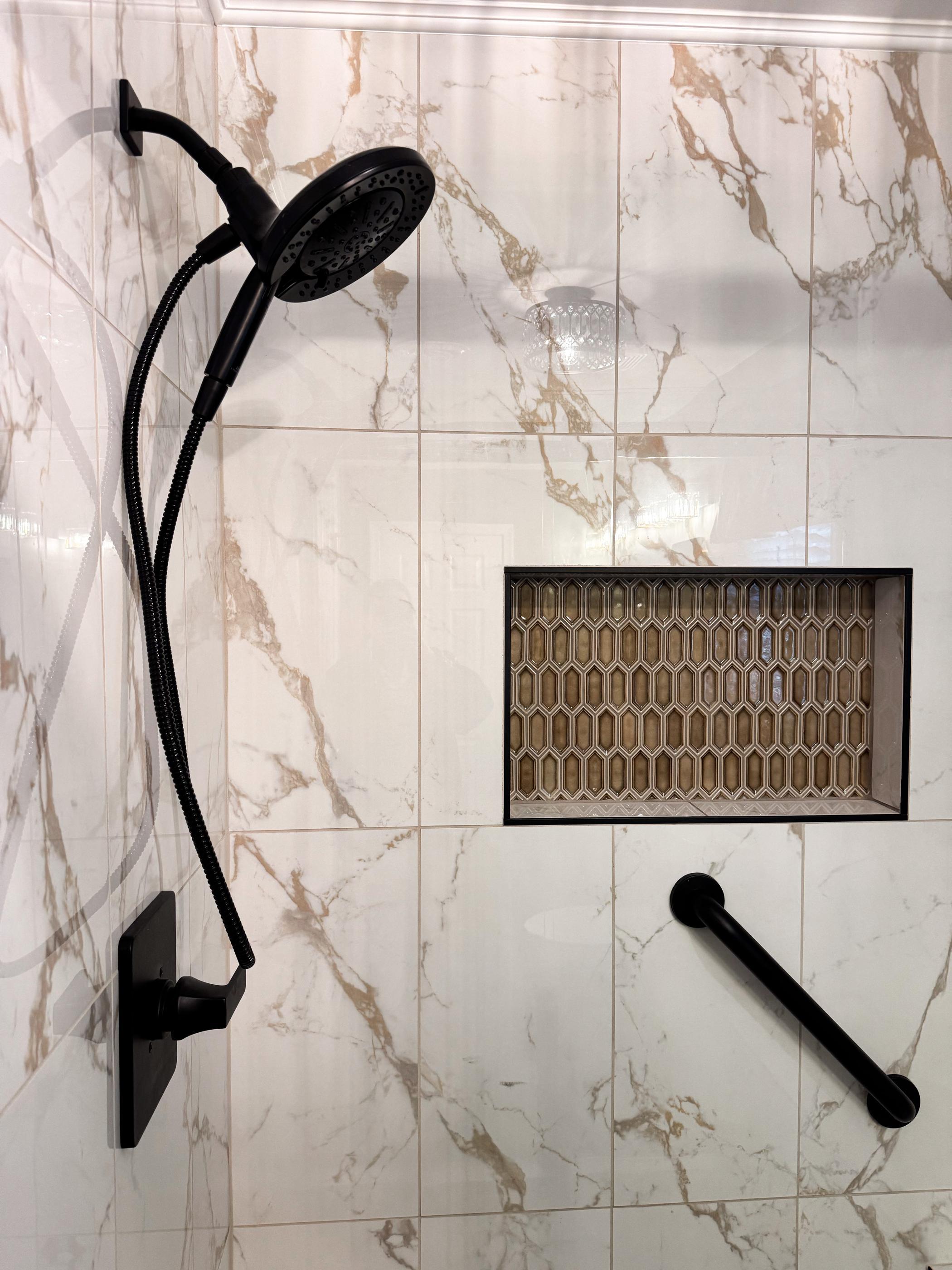 Black shower fixtures also look great with the most striking stone you can find. It’s still a neutral palette, but natural stone patterns are the focus, not intentional design features.