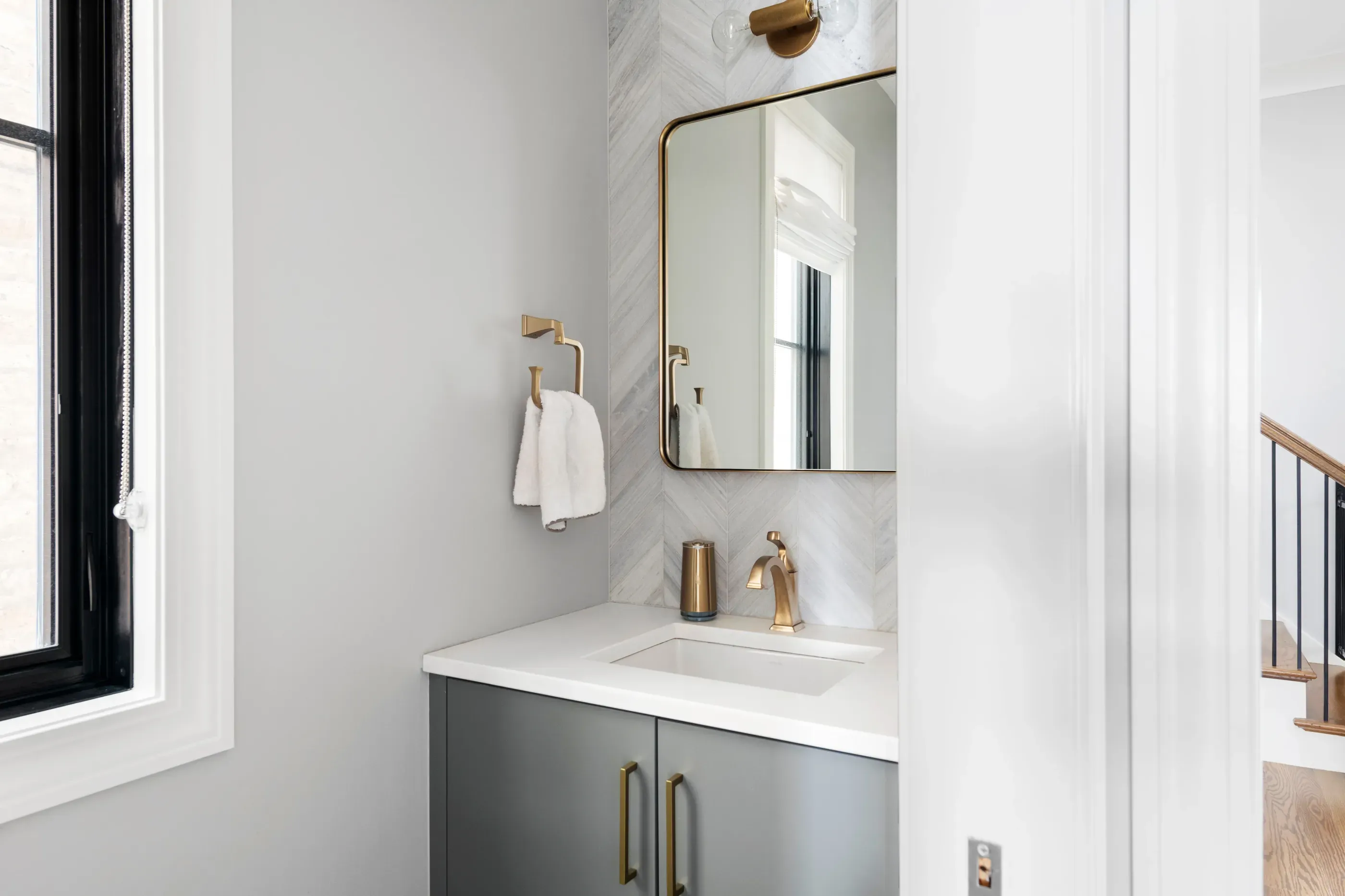 Warm up the cool, contemporary classic vibe of a half-bath with gold-toned details. A mix of polished and brushed finishes here enjoys a symbiotic relationship with the textural effects of a tile accent wall.