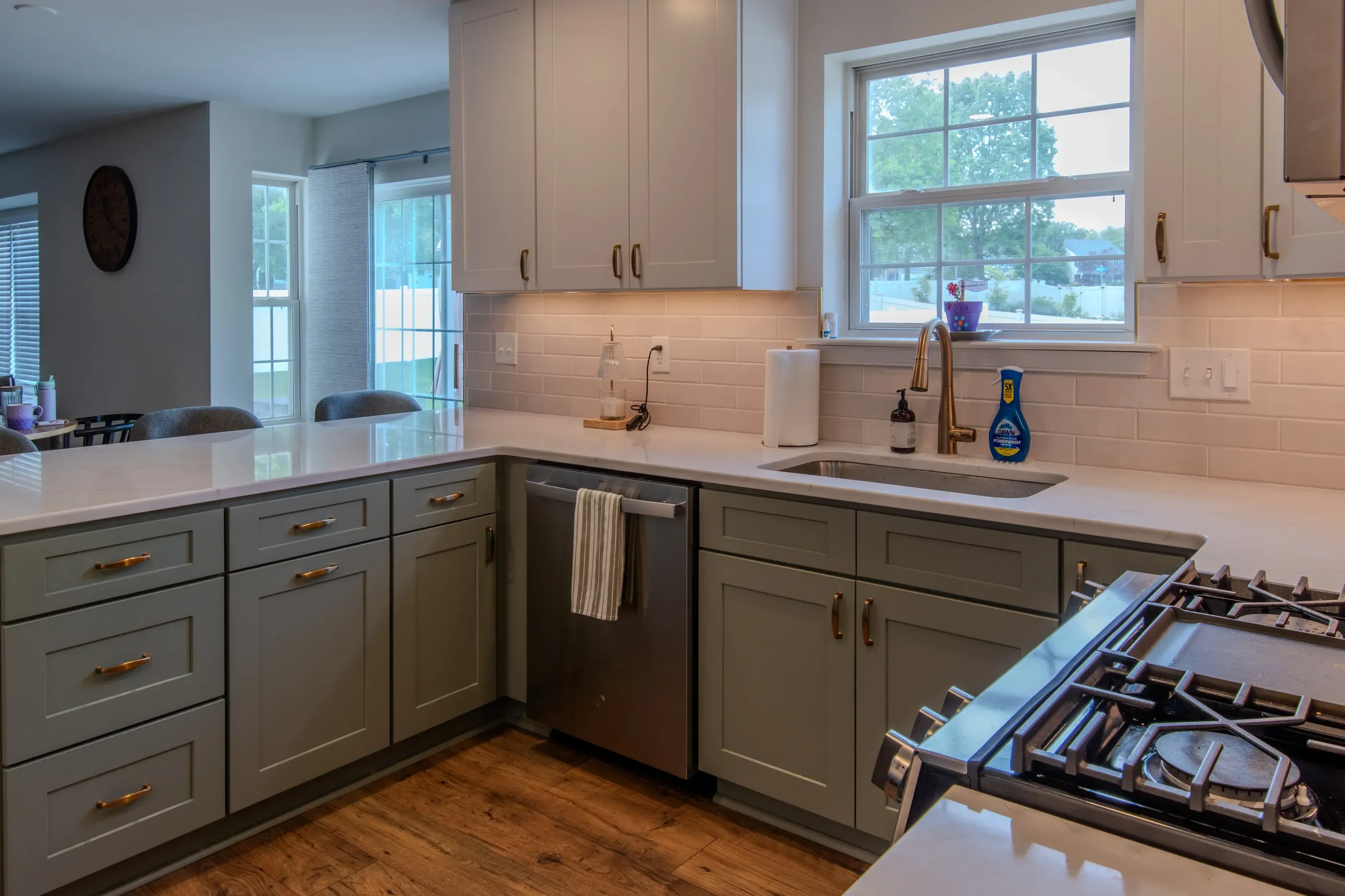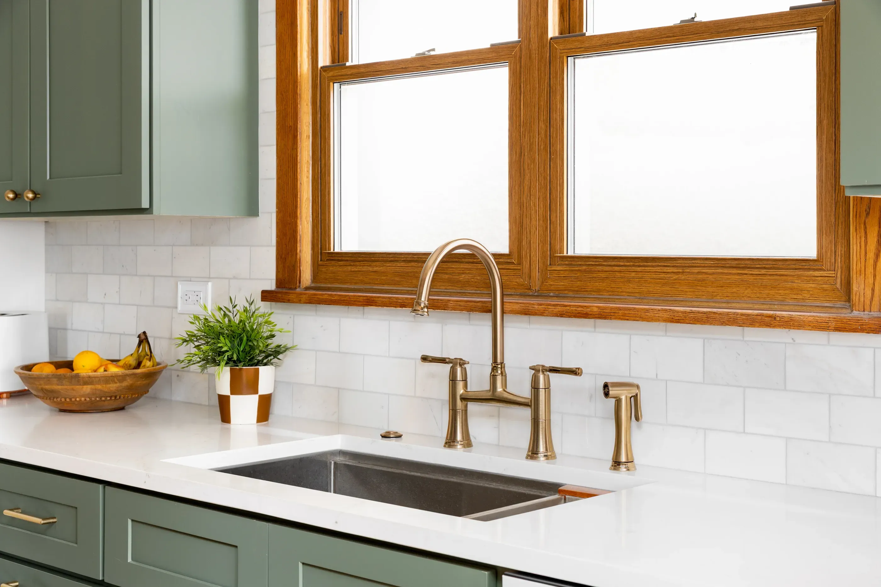 Adding more color to kitchens is a great design decision for 2026. Brass knobs, pulls, and a faucet are a better fit with natural wood trim and sage cabinets. The overall effect is perfect for transitional kitchens, where we want those modern touches without completely bucking tradition.