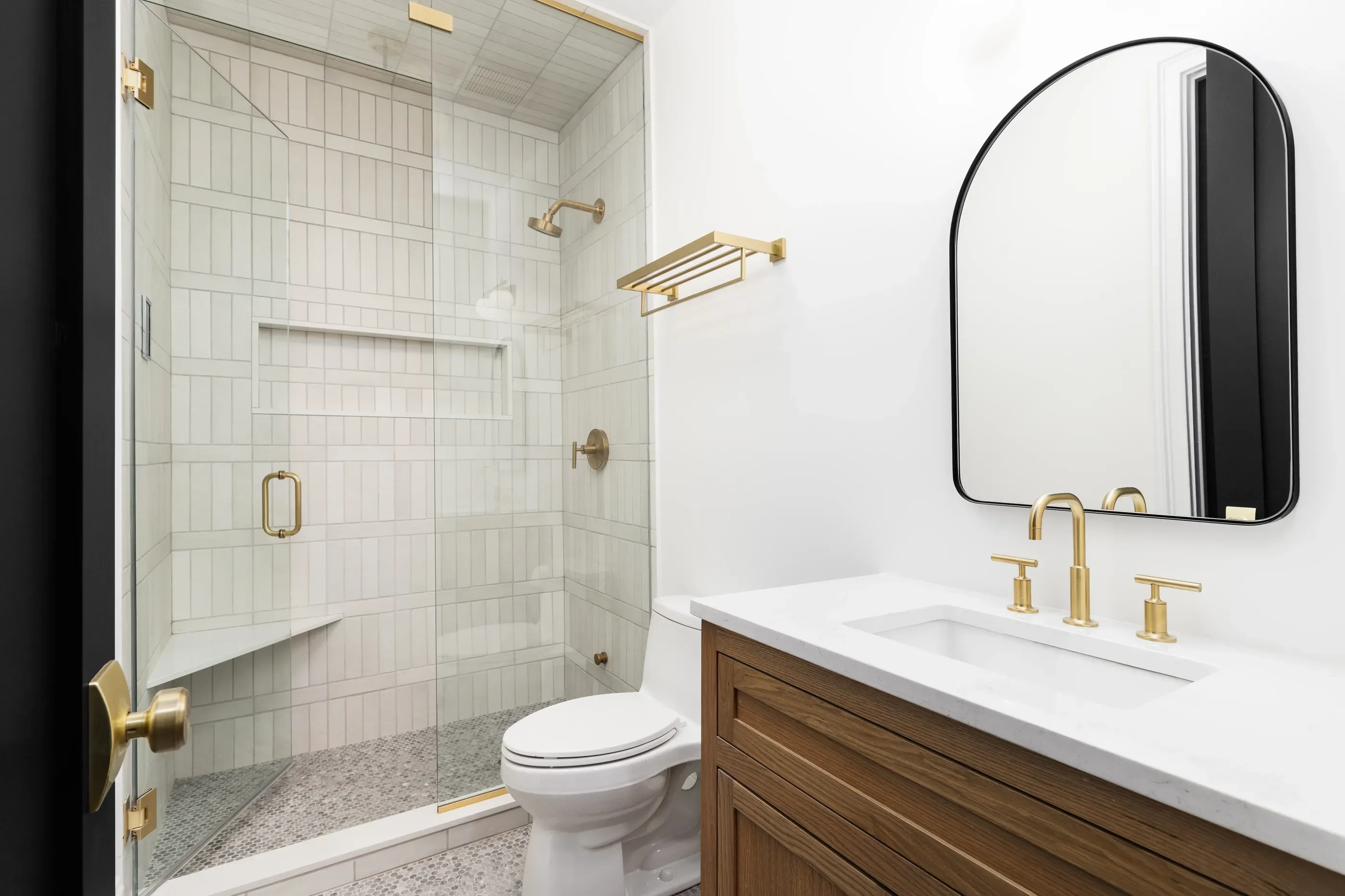 A neutral bathroom remodel is anything but basic when we add high-quality tilework and gold metals to the mix. Design a solid, timeless foundation, and layer on eye-attracting detail.
