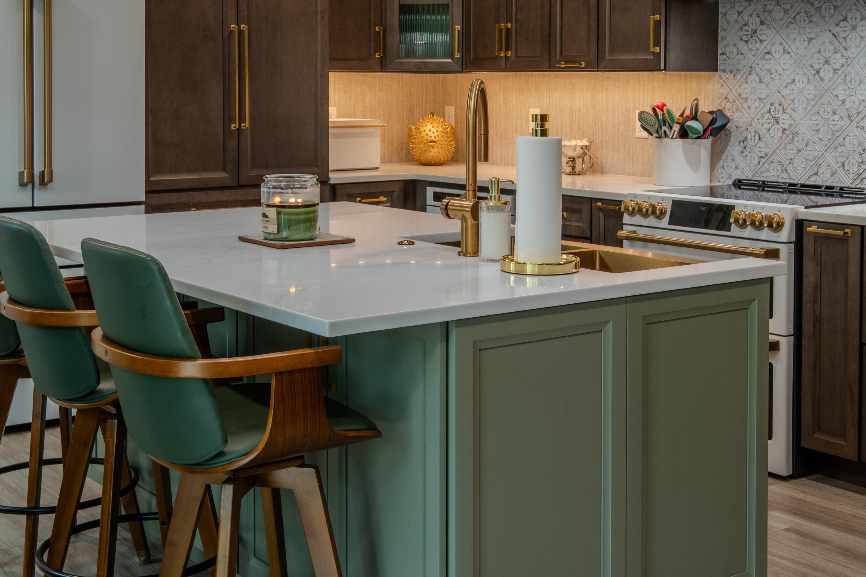 Found the perfect island seating? Let it inform the color of your island cabinetry. Muting the green shown here and lightening it up a notch keeps it from becoming a flat, uniform match. It adds character without competing with the fine woods and customized appliance finishes.