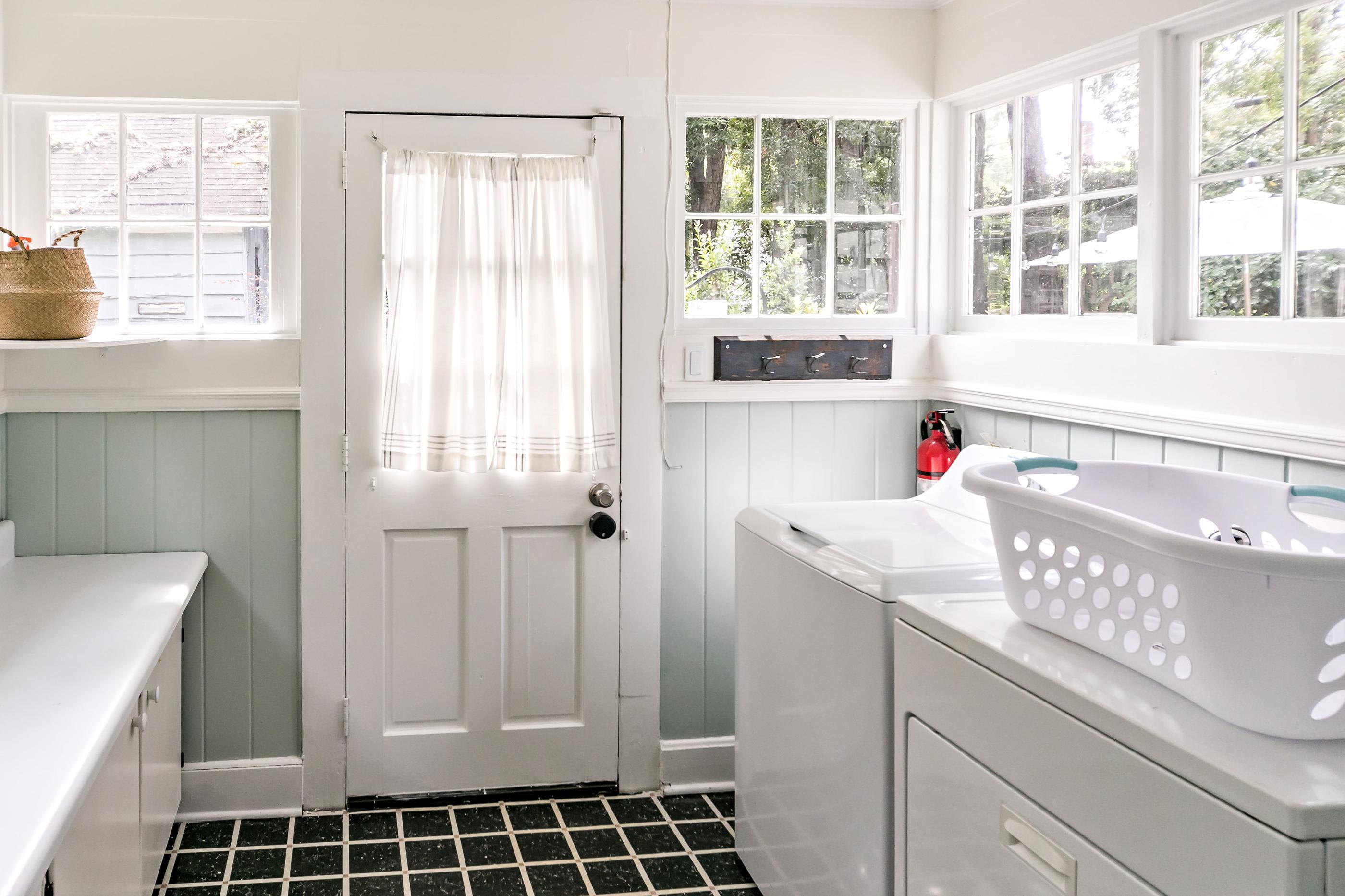 Fold fresh laundry in the sun with a retro-styled rear entryway laundry room. Pastel beadboard and timeless tile are the perfect way to style a classic, homespun washing-up spot.