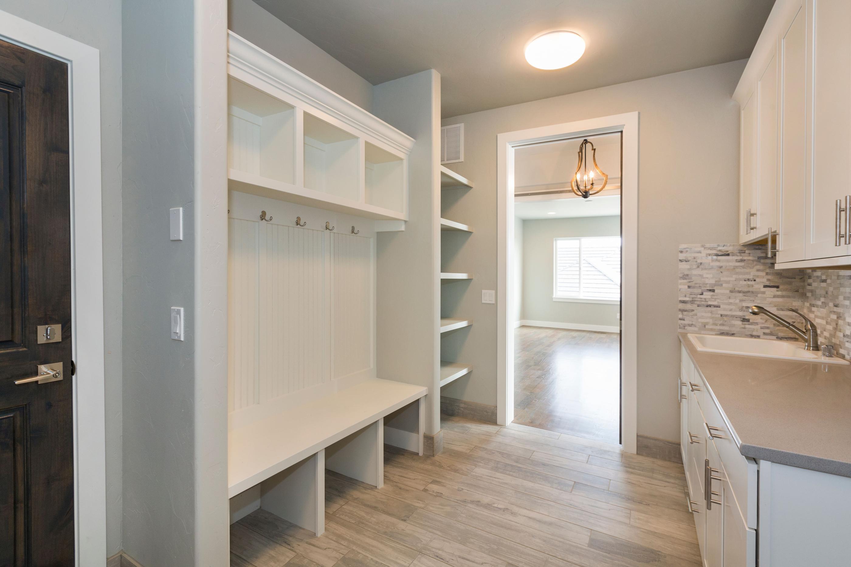 You’ll get cubbies, shelving, hooks, extra storage, and more. Use a common color palette for countertops, backsplashes, and flooring to maintain the flow and create smoothly styled transitions through the home.