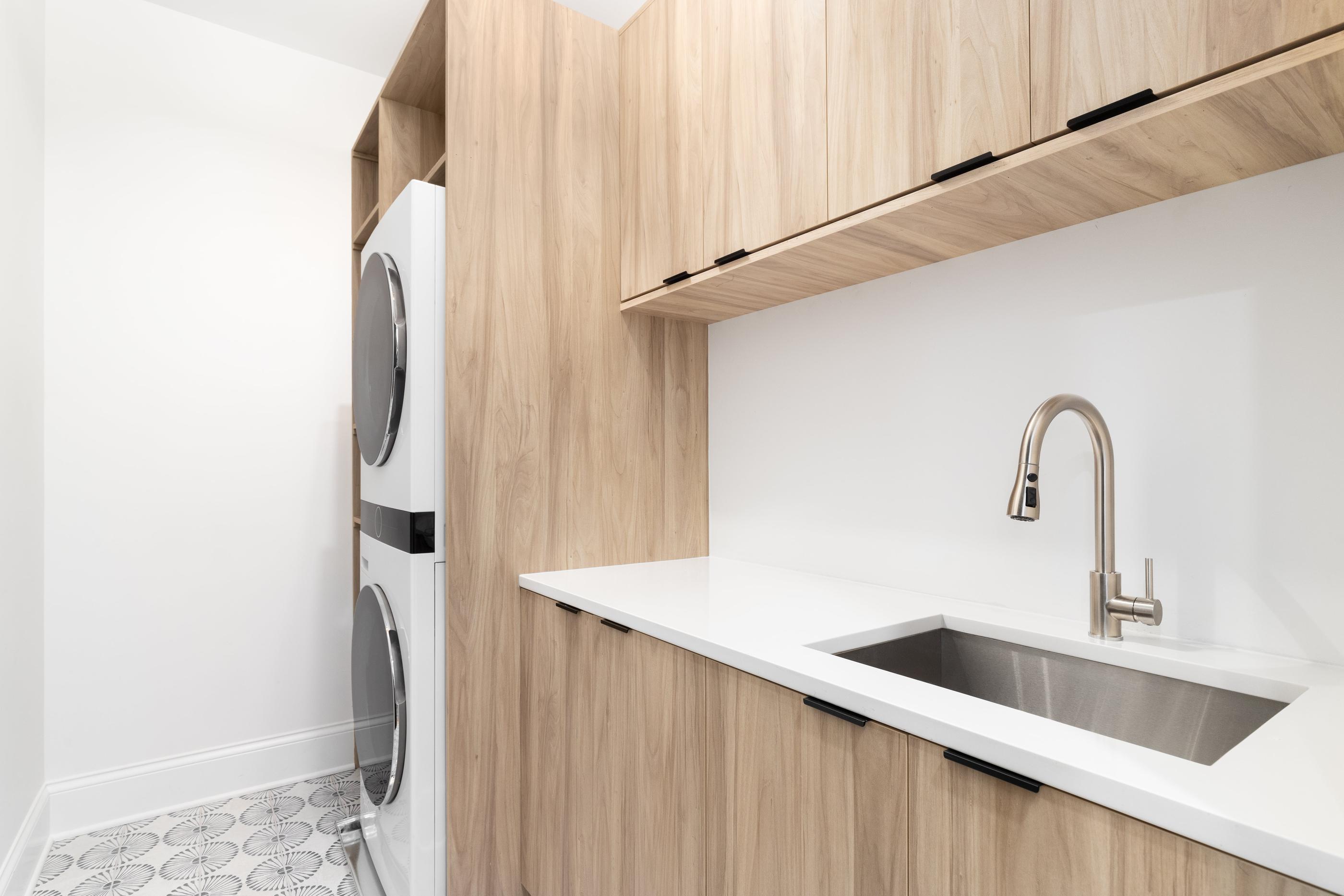 There’s no need to keep the laundry room concealed behind closed doors when it’s as design-forward as the rest of your home. Stacked machines integrated into elegant oak cabinetry free up enough room for a sink and storage. Patterned tile flooring keeps it from being too stark.
