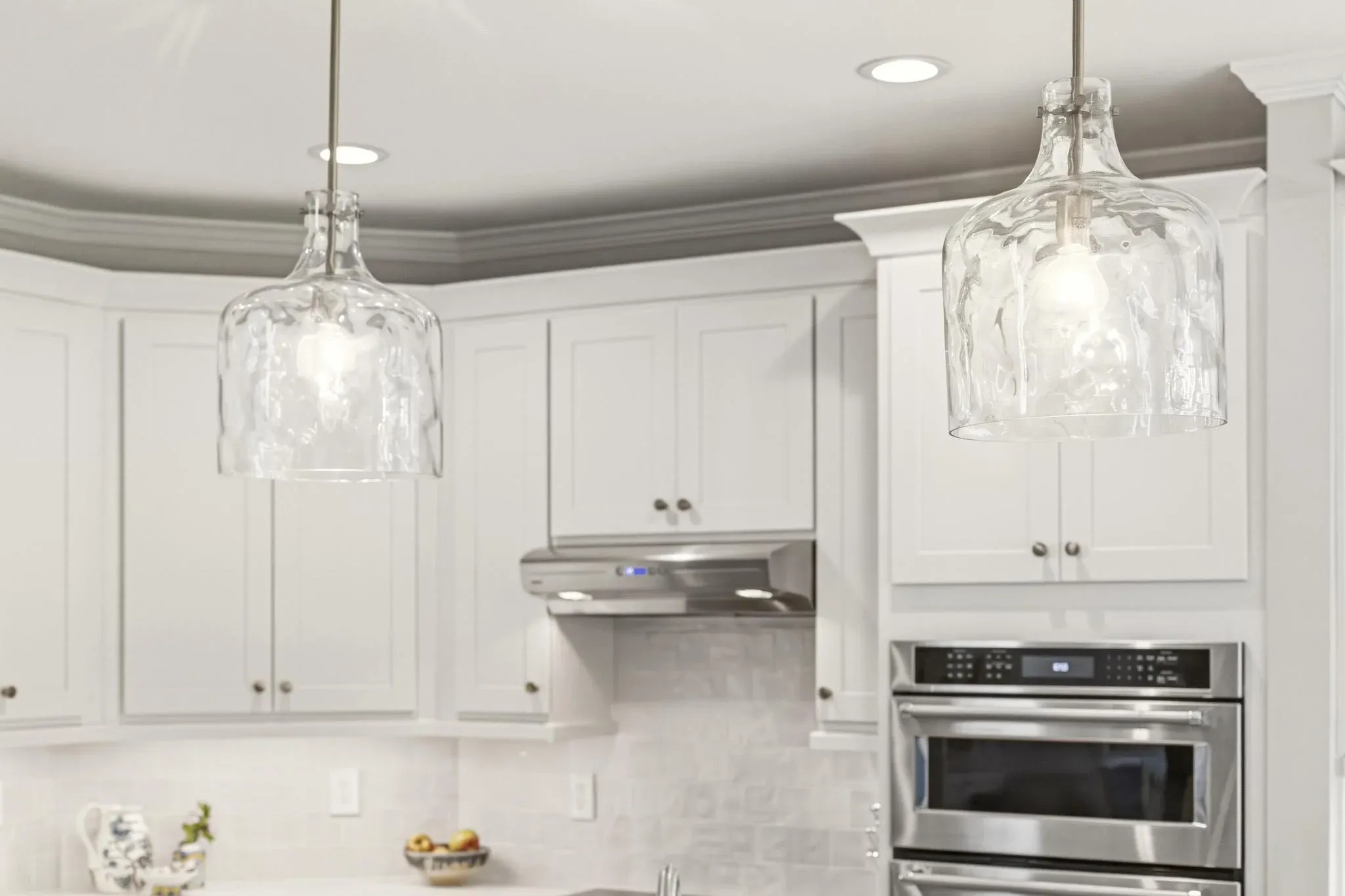 Crown molding. Narrower gaps become features, not blank spaces, when we add more custom detail. Crown molding is interesting, intentional, and timeless. It may also work better with the lighting.