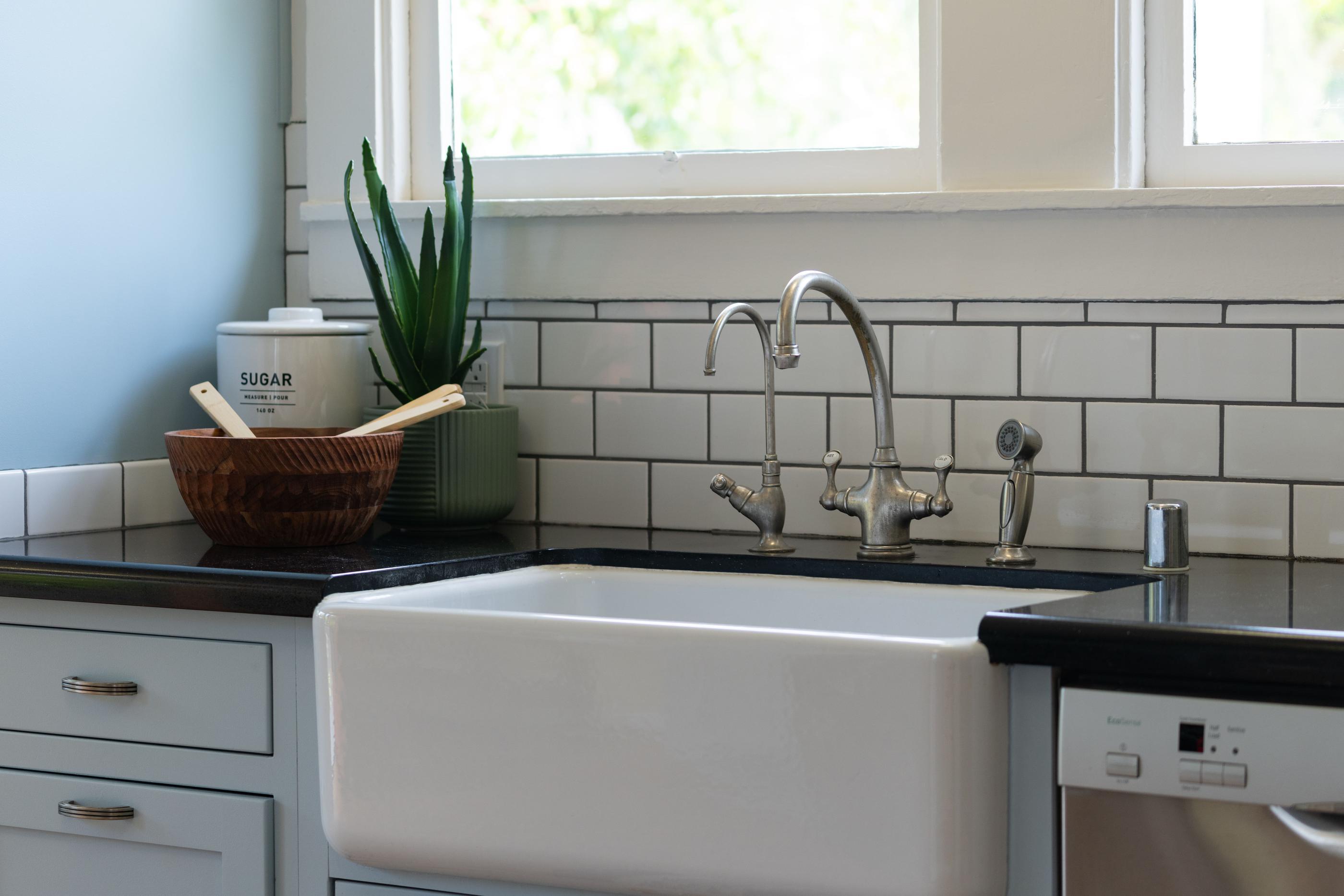 Black solid surface or quartz counters can evoke quaint charm. Black-grouted tile backsplashes are a worthy co-conspirator, creating something ageless yet deeply familiar. Cottage core mainstays like a farmhouse sink and pastel walls keep it extra-approachable.