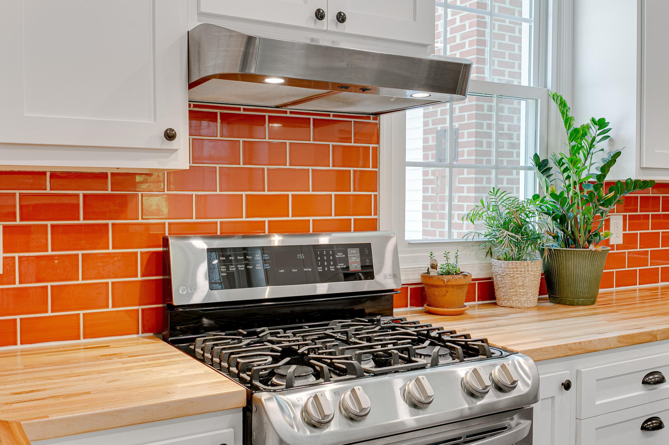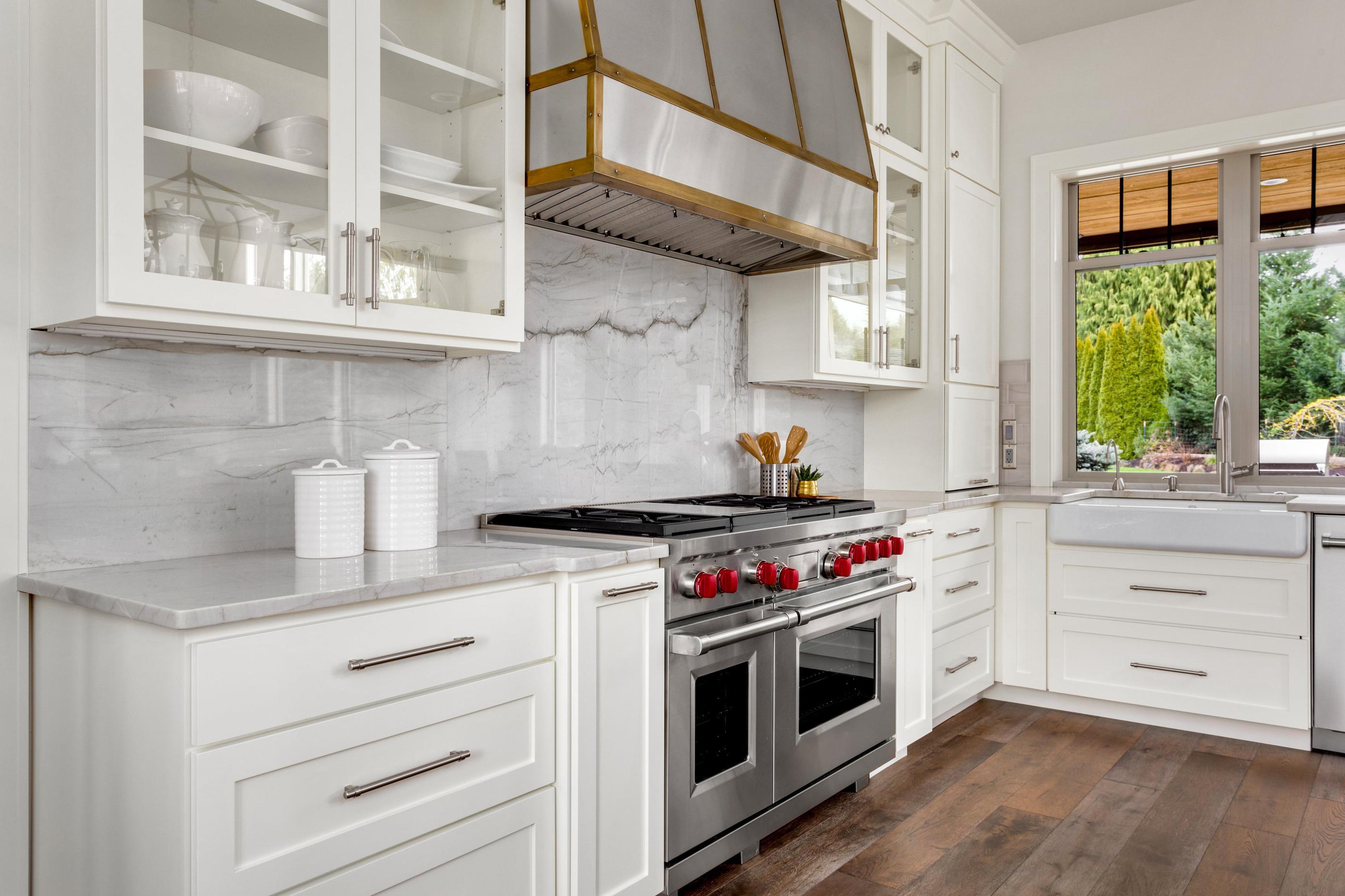 Countertops and backsplashes ensure that white cabinetry never looks basic or trendy. The bold choice of orangey-red subway tile registers as brick, minus the rough, tougher-to-clean surface. Wood butcher block countertops are another Old World callback that adds a bit of rustic edge to an otherwise modern remodel.