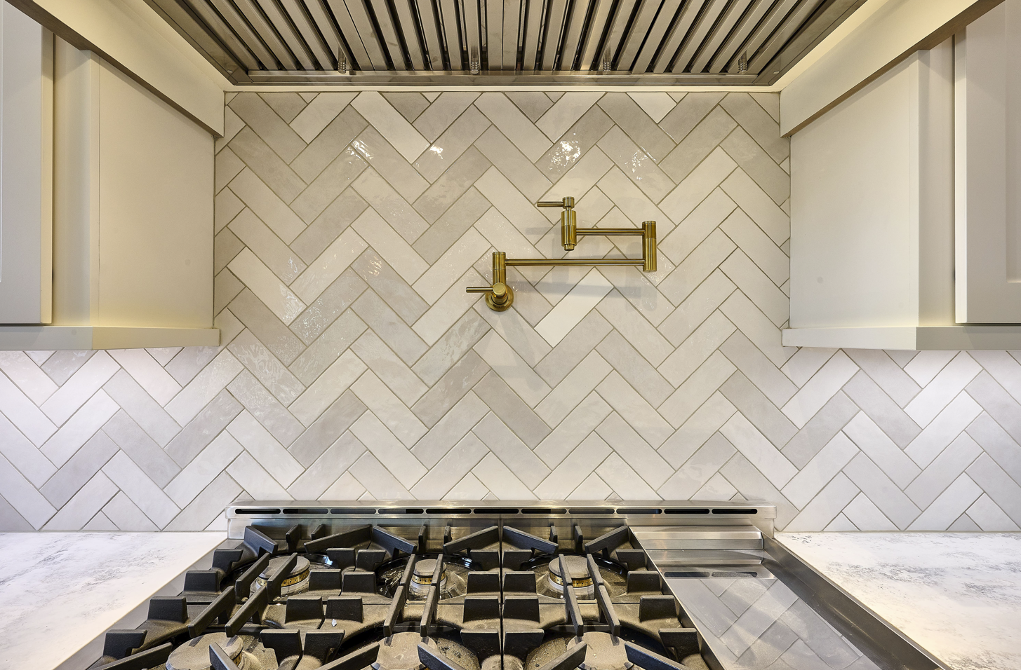 If matchy-matchy isn’t your style, but put-together is, try this. A palette of cool whites and dove grays is common in marble-effect quartz counters. Carry it over in carefully arranged chevron tilework backsplashes. Dimension without disruption.