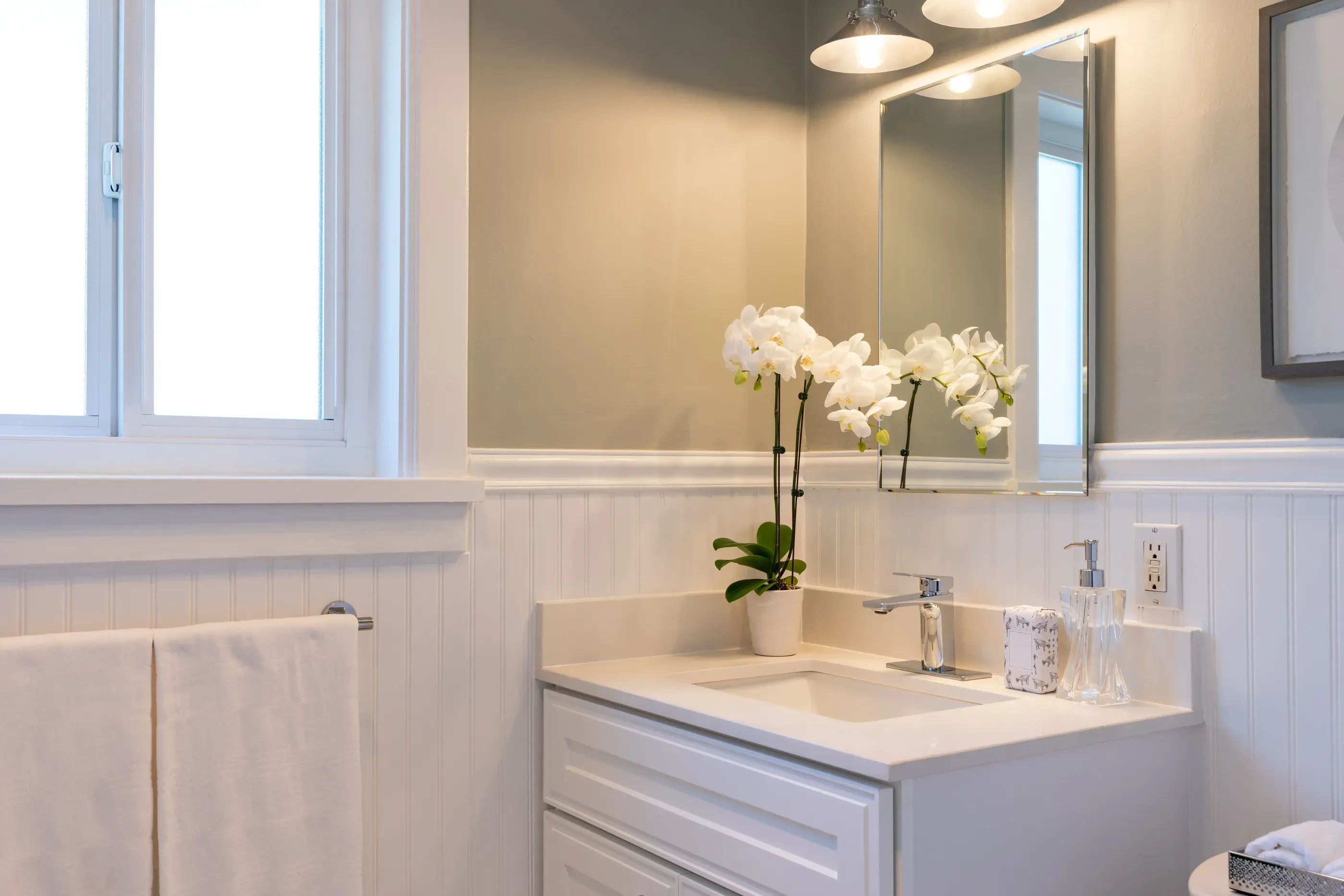 Every color reflects a certain amount of light. The type of light in your bathroom will mute or maximize this. Natural light, layered lighting, dimmer single-sources, LED feature lighting, and more affect how a paint color will translate.