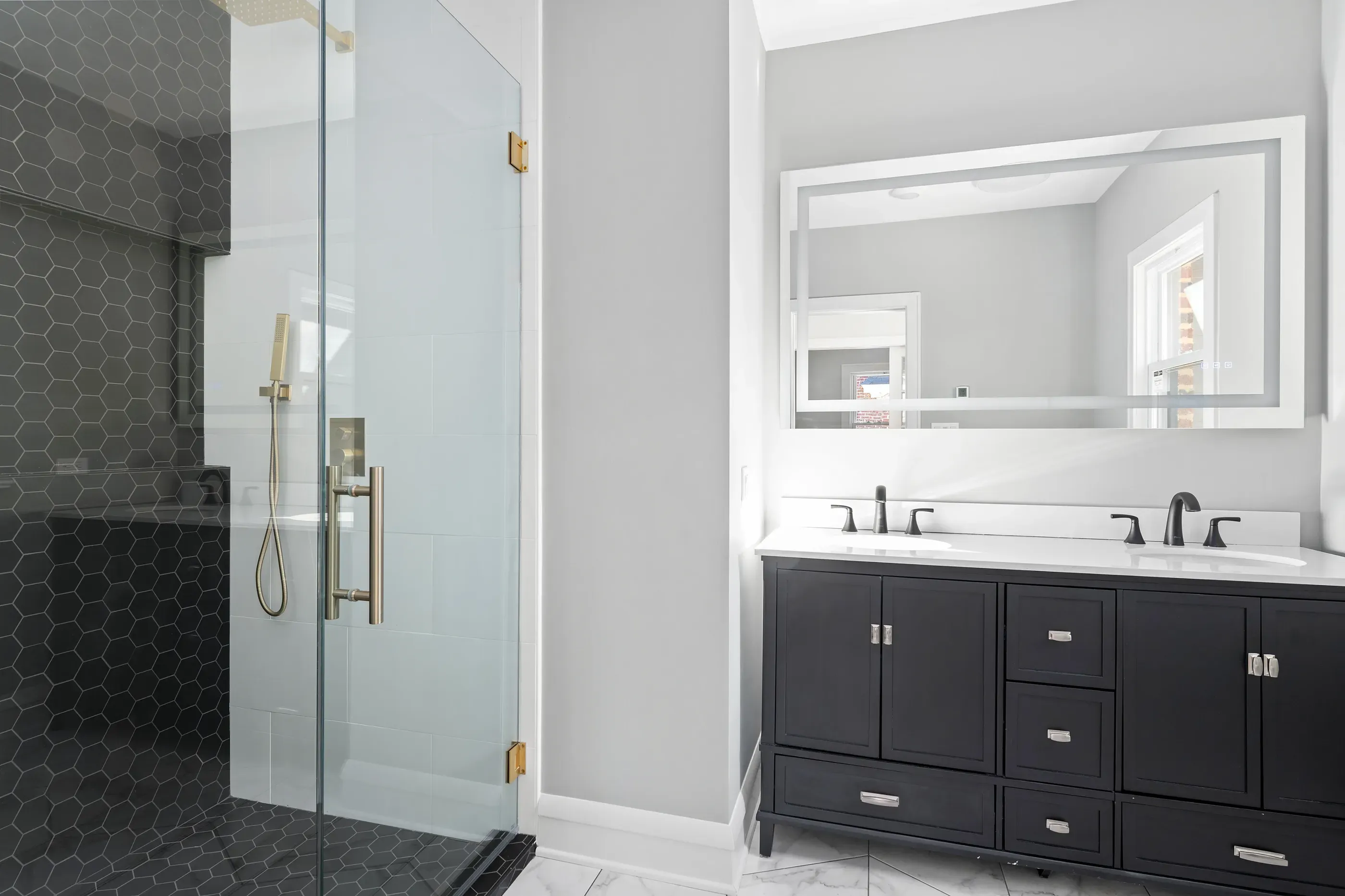 Black cabinetry and tilework are the basis of many very stunning high-contrast designs. Choosing a softer gray instead of white makes the transition feel less forced without losing impact. Brushed champagne brass instead of yellower golds also makes a difference.
