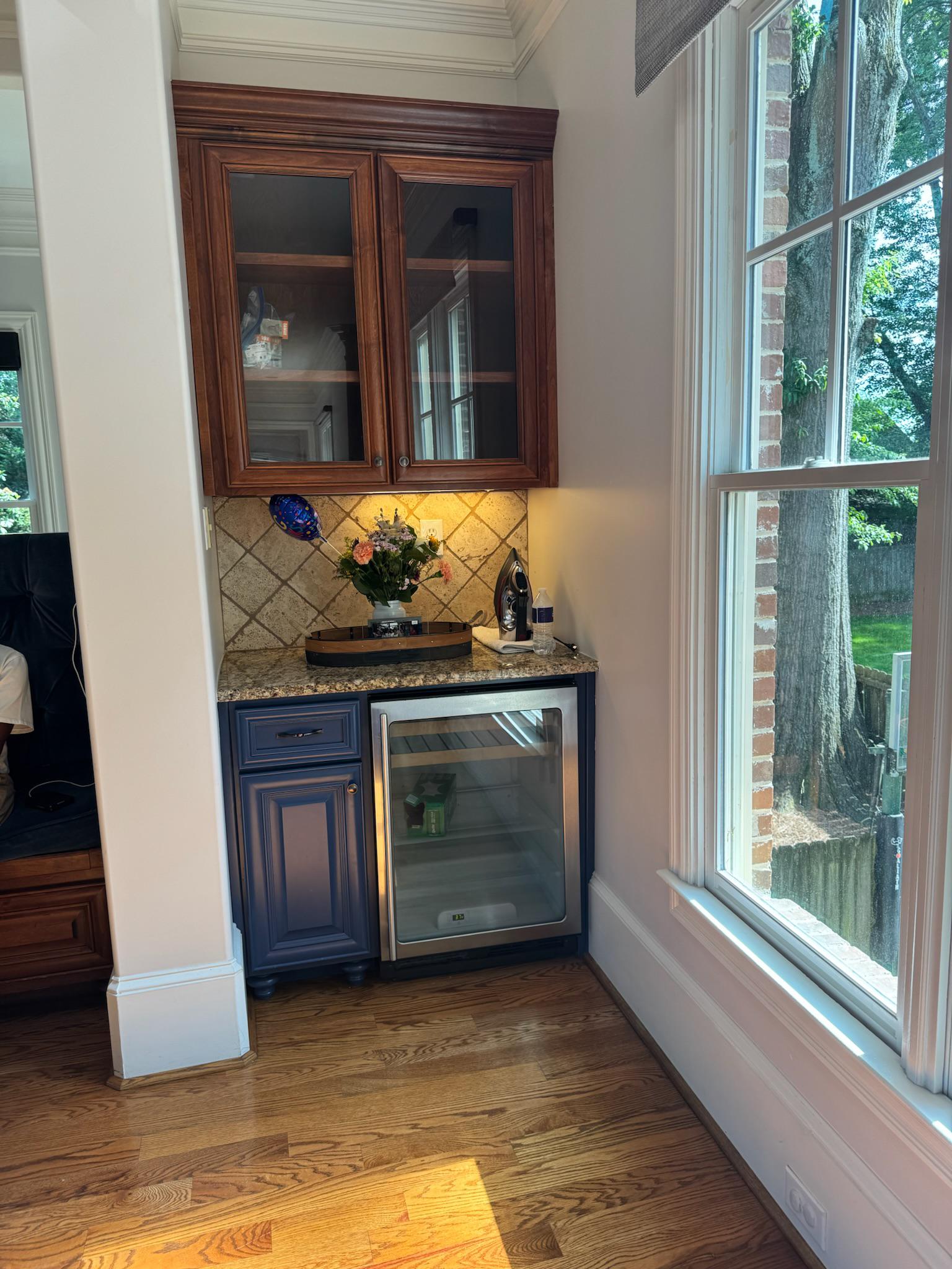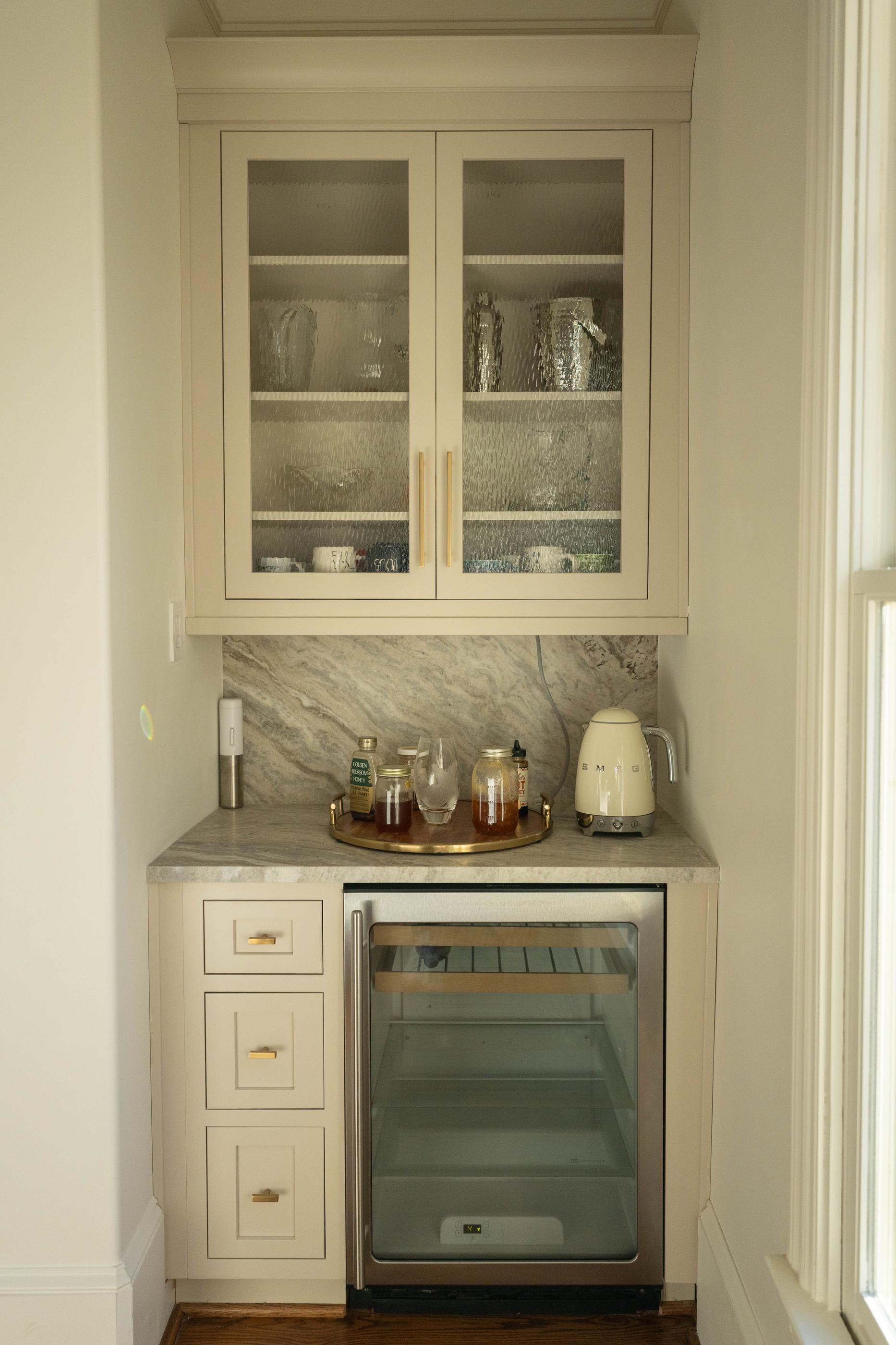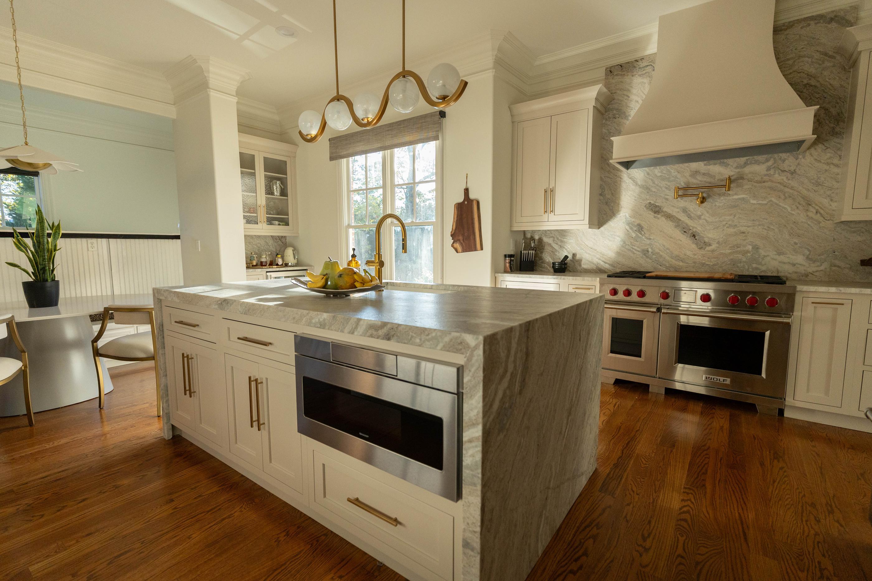 This kitchen transformation is a striking example of how thoughtful design can completely redefine a space. What was once a dark, traditional kitchen with heavy finishes and visual separation has been reimagined into a light-filled, elegant hub designed for both everyday living and effortless entertaining. The new design embraces a soft, neutral palette that instantly brightens the room and enhances its architectural beauty. Custom cabinetry in a warm, creamy finish replaces the former dark tones, creating an airy, cohesive look that allows the space to feel expansive and inviting. Brushed brass hardware and fixtures introduce warmth and subtle luxury, adding character without overpowering the design. The result is a sophisticated, welcoming kitchen that feels bright, balanced, and intentional all while keeping the homes character.