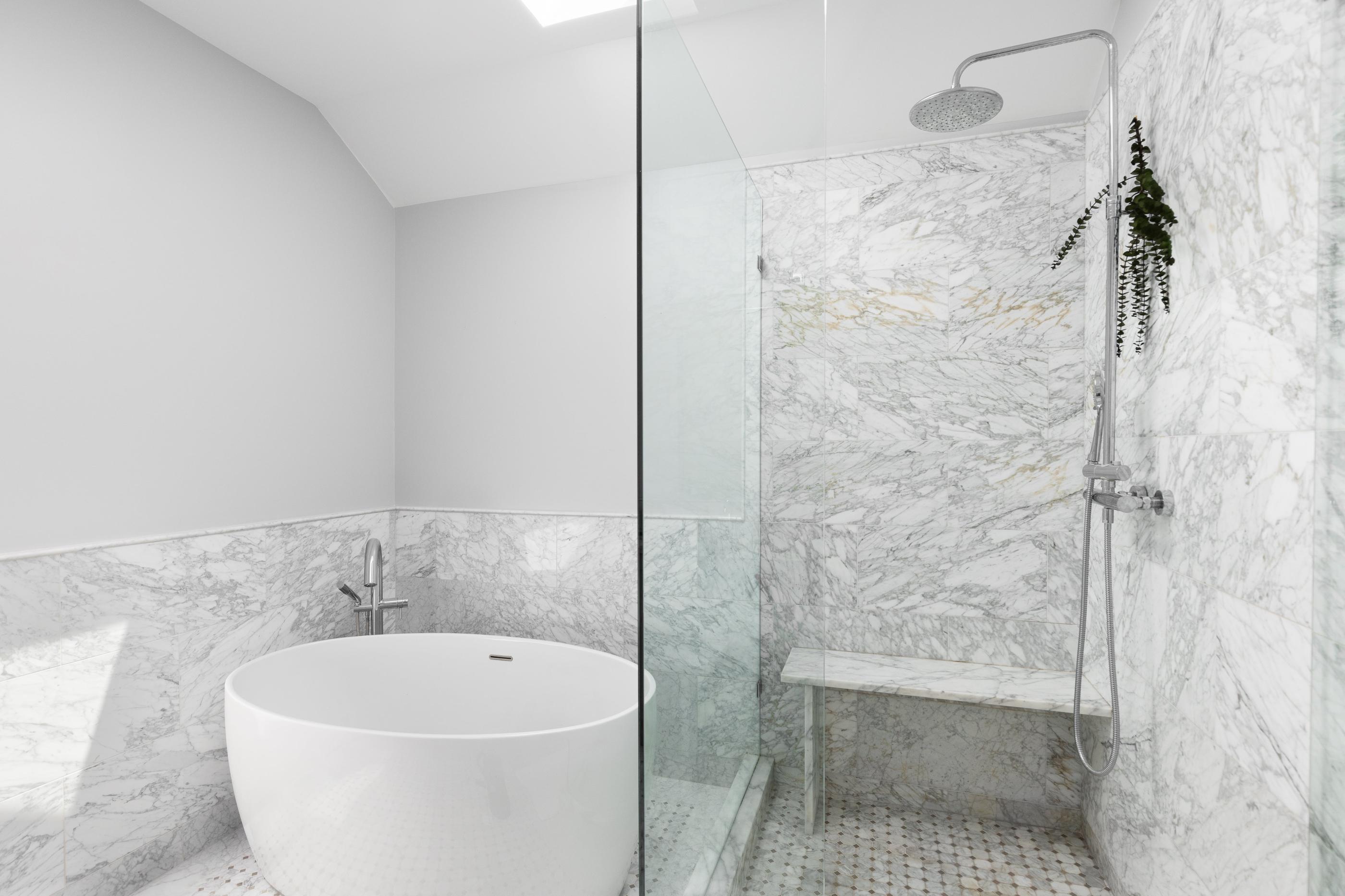 When you think of people ditching their bathtubs, it calls to mind those beige-tiled corner jet spas that took up half the primary. The new and improved version resembles a bench with its clean lines and groutless stone-look tilework.